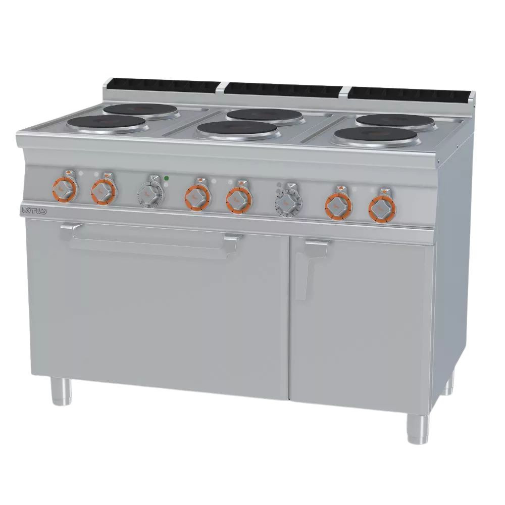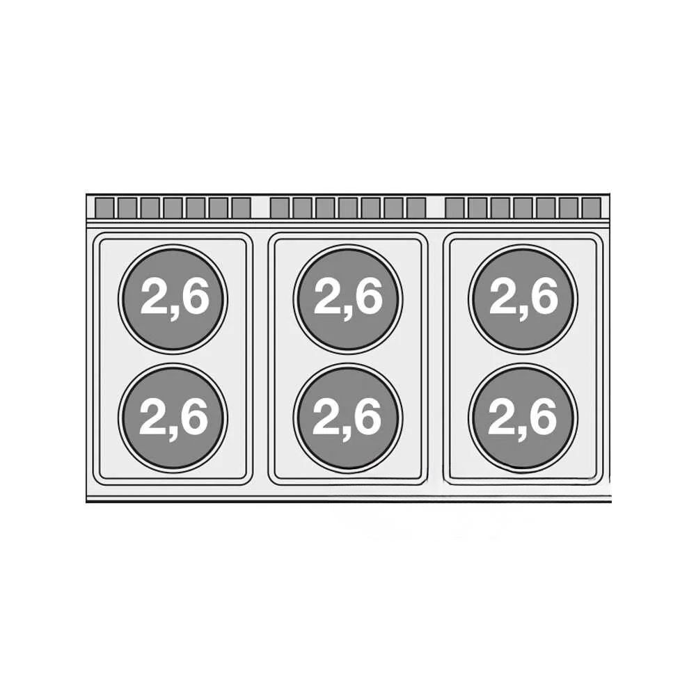 Olaszországban gyártott, rozsdamentes acél kivitelű elektromos ipari tűzhely, 6 zónával, 2 mm vastag munkalappal, légkeveréses sütővel, alsó tárolóval, IPX5 védelemmel. A körlapos főzőfelületek öntöttvasból készültek, a tekerőgomb 7 pozícióval rendelkezik. Sütőrács mérete: GN1/1.