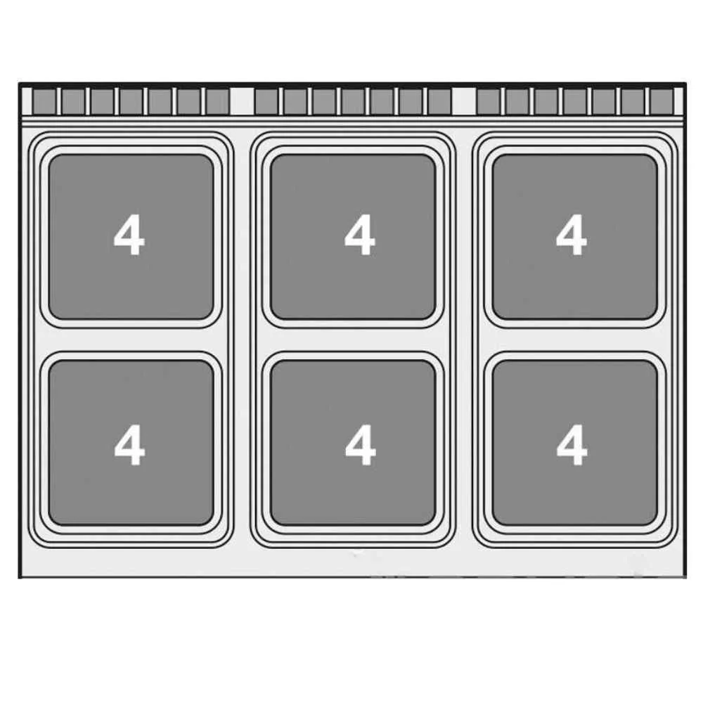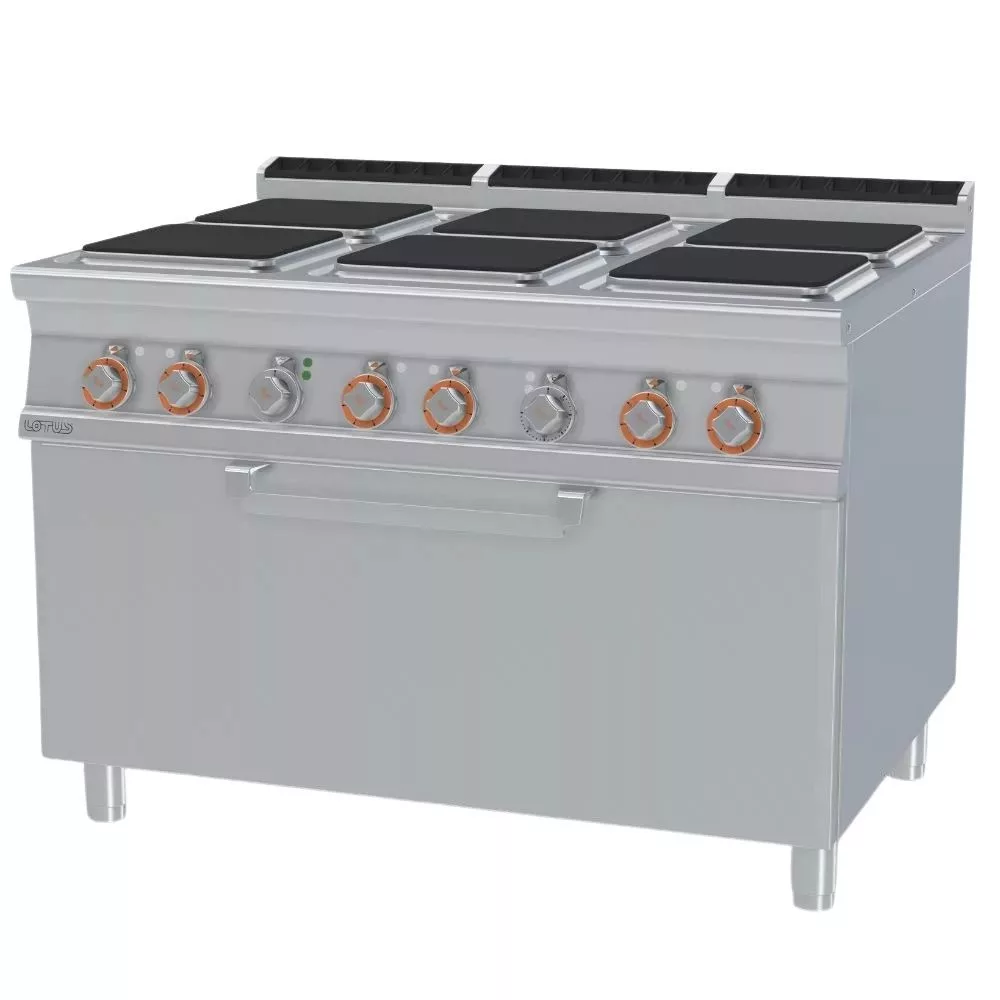 Olaszországban gyártott, rozsdamentes acél kivitelű elektromos ipari tűzhely, 6 zónával, 2 mm vastag munkalappal, elektromos statikus sütővel, tárolóval, IPX5 védelemmel. A szögletes főzőfelületek öntöttvasból készültek, a tekerőgomb 7 pozícióval rendelkezik. Sütőrács mérete: 1050x710 mm.