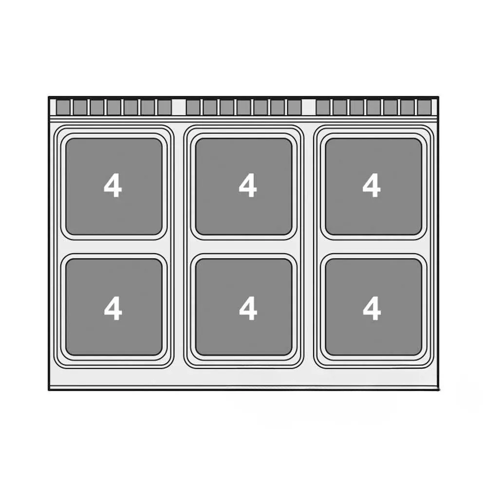 Olaszországban gyártott, rozsdamentes acél kivitelű elektromos ipari tűzhely, 6 zónával, 2 mm vastag munkalappal, elektromos légkeveréses sütővel, tárolóval, IPX5 védelemmel. A szögletes főzőfelületek öntöttvasból készültek, a tekerőgomb 7 pozícióval rendelkezik. Sütőrács mérete: GN1/1.