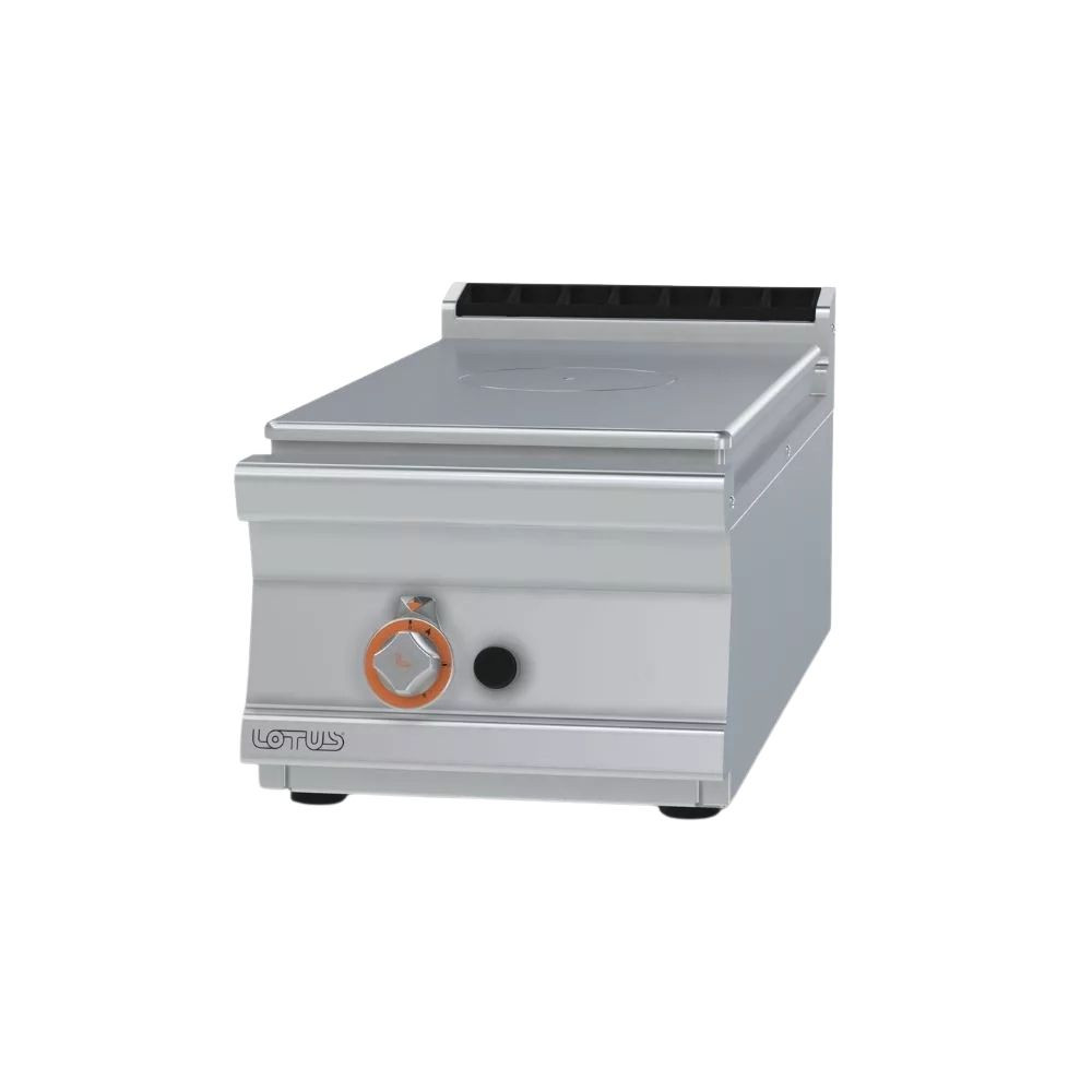 Olaszországban gyártott, rozsdamentes acél kivitelű, gázüzemű, ipari asztali tűzhely, főzőlap, 2 mm vastag munkalappal, IPX5 védelemmel. A főzőfelület 1 zónás francia lap.