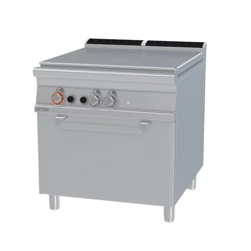 Olaszországban gyártott, rozsdamentes acél kivitelű, gázüzemű ipari tűzhely, főzőlap, 1 zónával, 2 mm vastag munkalappal, gázüzemű statikus sütővel, IPX5 védelemmel. A főzőfelület 1 zónás francia lap. Sütőrács mérete: GN2/1.