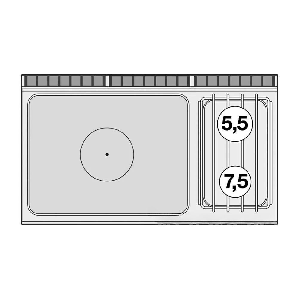 A két égőfej lehetővé teszi az egyidejű, különböző hőmérsékletet igénylő műveletek végzését — például gyors pirítást és lassú főzést egyszerre. Az egyzónás francia lap széles, folyamatos főzőfelületet biztosít, amely alkalmas nagyobb edények, serpenyők és griddle-megoldások használatára, így ideális zsúfolt, professzionális műveletekhez.