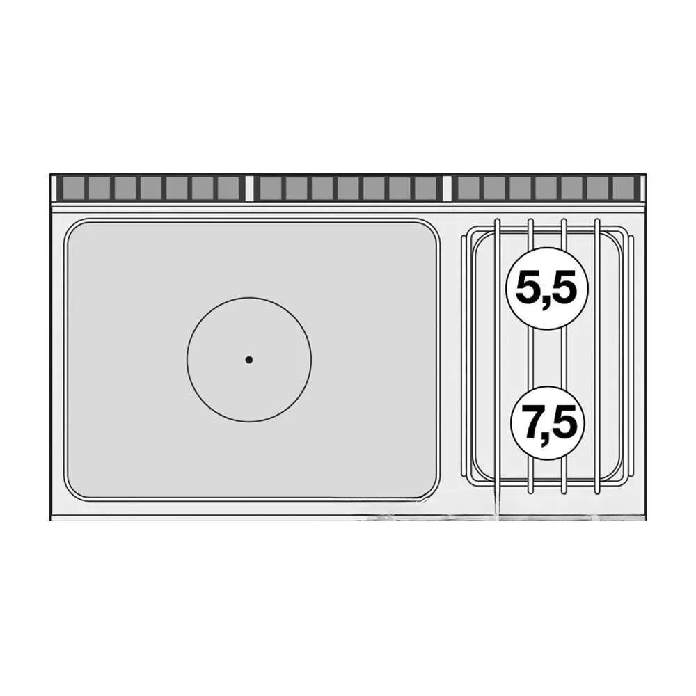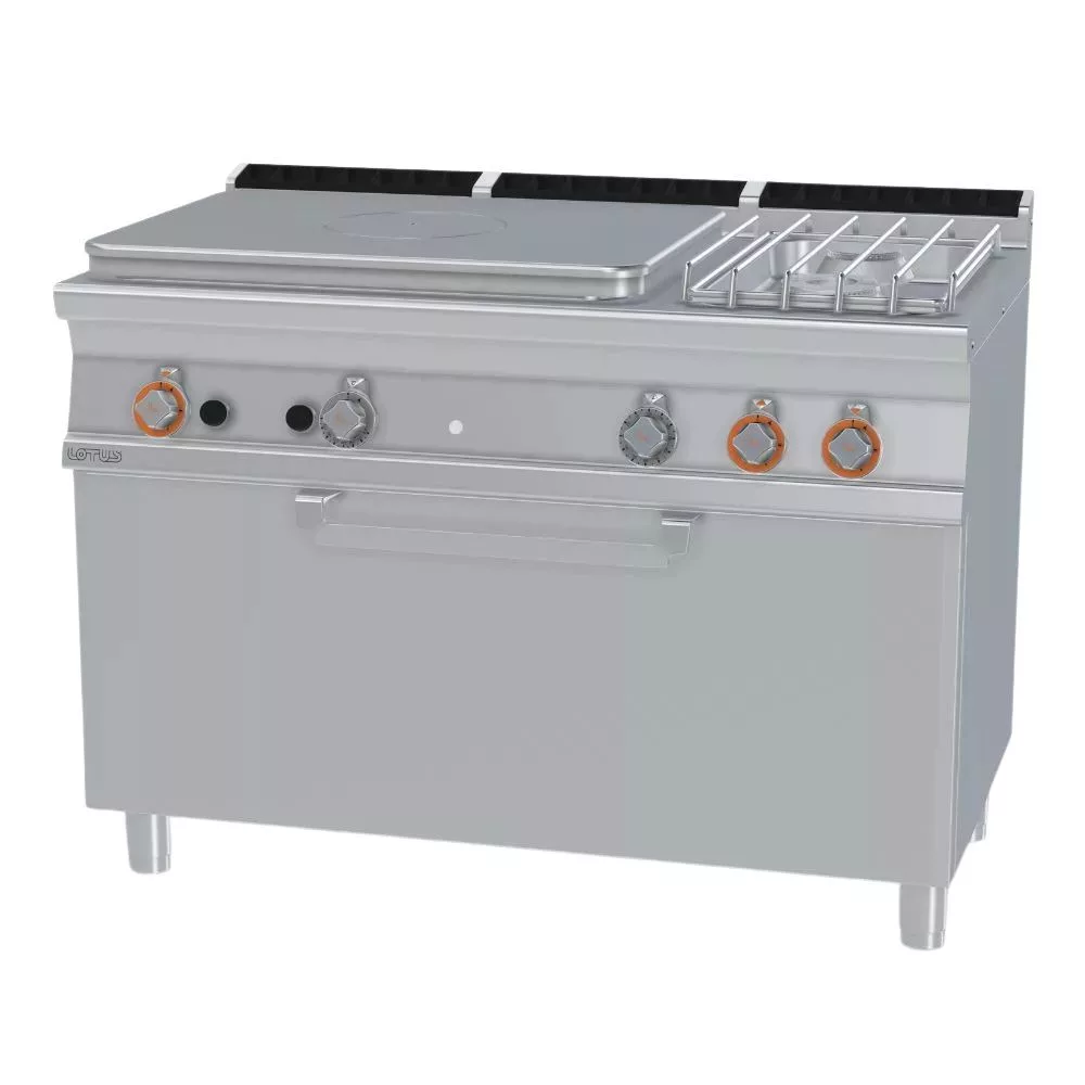 Olaszországban gyártott, rozsdamentes acél kivitelű, gázüzemű, ipari tűzhely, főzőlap, 2 mm vastag munkalappal, gázüzemű statikus sütővel, IPX5 védelemmel. A főzőfelület 1 zónás francia lap és 2 égőfej.