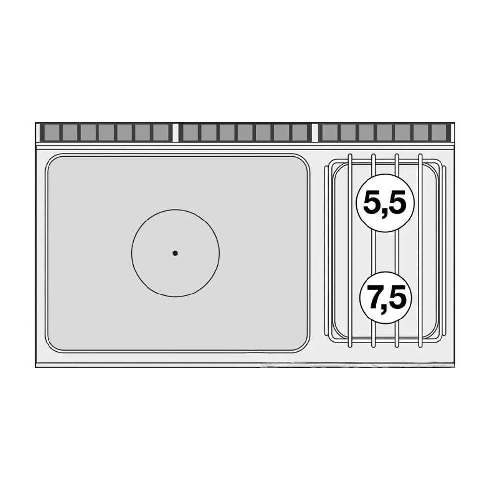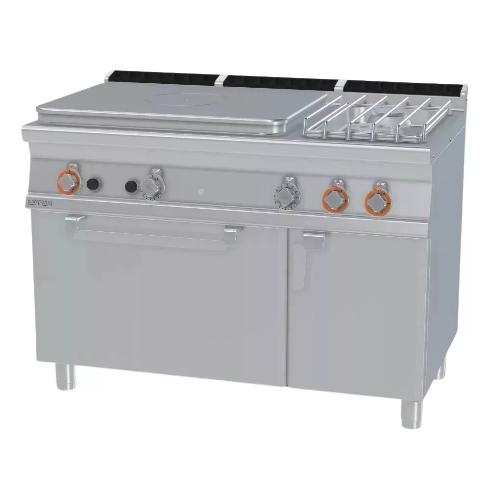 Olaszországban gyártott, rozsdamentes acél kivitelű, gázüzemű ipari tűzhely, főzőlap, 2 mm vastag munkalappal, gázüzemű statikus sütővel, tárolóval, IPX5 védelemmel. A főzőfelület 1 zónás francia lap és 2 égőfej. Sütőrács mérete: GN2/1.