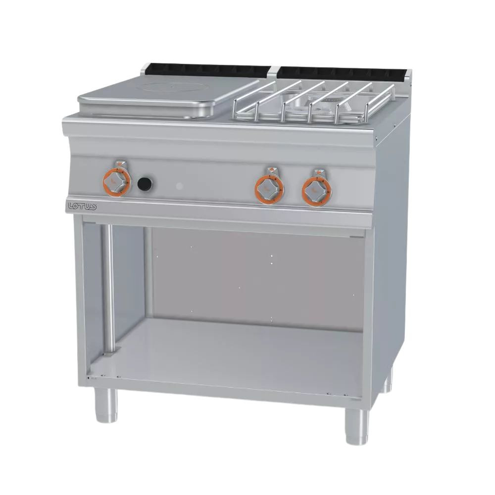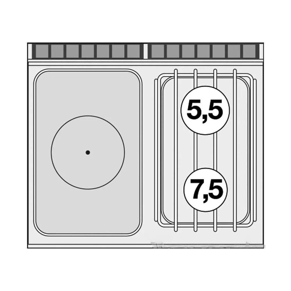 A készülék összteljesítménye 20 kW, ami lehetővé teszi gyors forralást, erős pirítást és folyamatos, egyenletes hőleadást nagyobb konyhai terhelés alatt is. A 1 zónás francia lap ideális nagy edények vagy serpenyők központi elhelyezésére, míg a két égőfej különálló lángszabályozást tesz lehetővé az egyszerre folyó többféle művelethez. Ez a kombináció különösen hasznos például gyors előkészítésnél, pörkölésnél és nagy volumenű főzési műveleteknél.