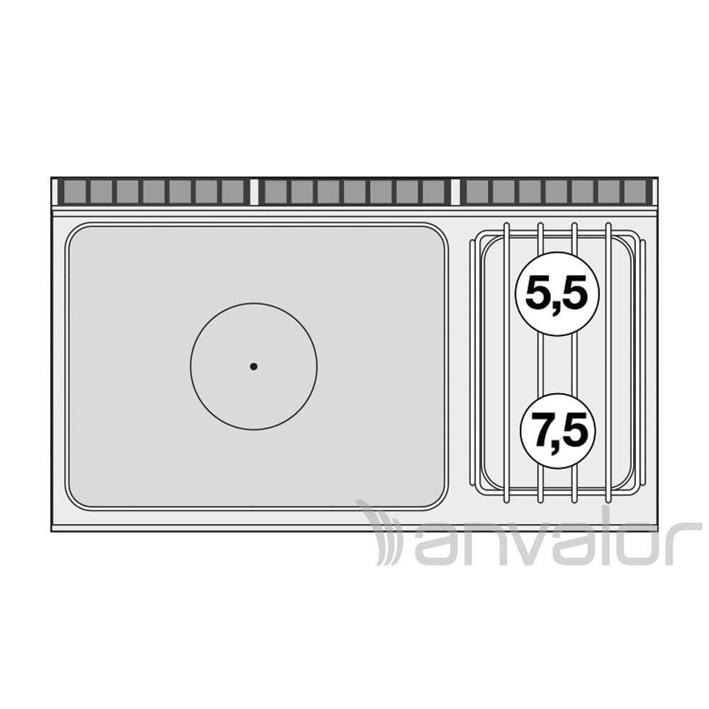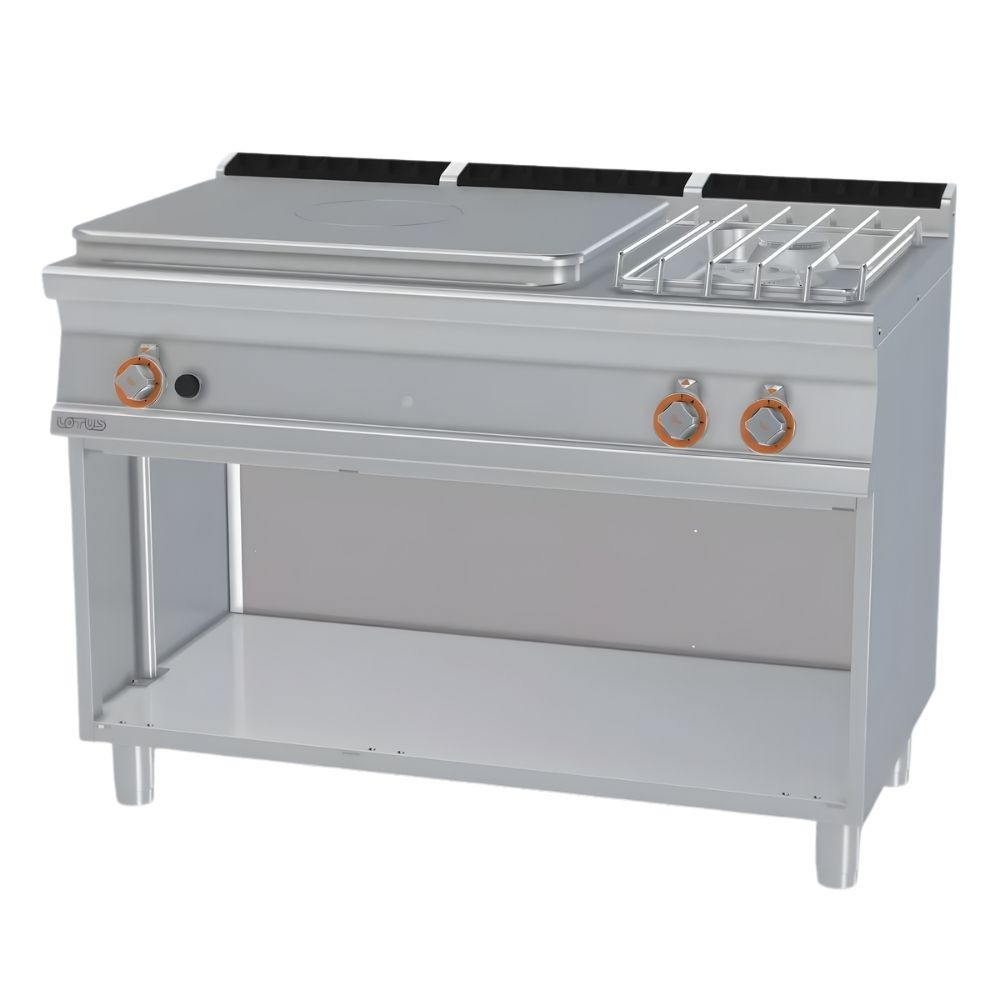 Olaszországban gyártott, rozsdamentes acél kivitelű, gázüzemű, ipari tűzhely, főzőlap, 2 mm vastag munkalappal, nyitott alsó tárolóval, IPX5 védelemmel. A főzőfelület 1 zónás francia lap és 2 égőfej.