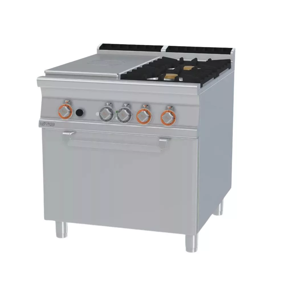 Olaszországban gyártott, rozsdamentes acél kivitelű, gázüzemű ipari tűzhely, főzőlap, 2 mm vastag munkalappal, elektromos légkeveréses sütővel, IPX5 védelemmel. A főzőfelület 1 zónás francia lap és 2 égőfej. Sütőrács mérete: GN1/1.