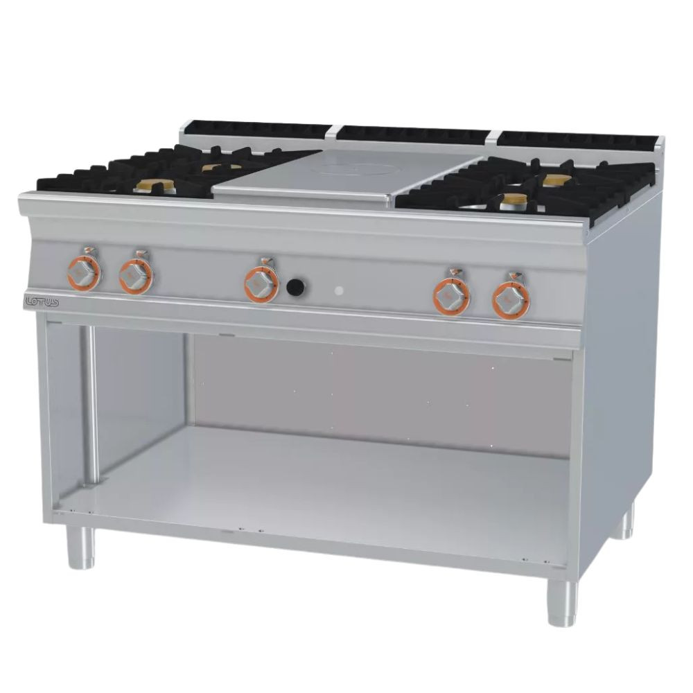 A berendezés erőteljes, 35 kW összteljesítményének köszönhetően gyors hőleadást és folyamatos munkavégzést biztosít még intenzív üzem mellett is. A francia lap stabil, egyenletes főzési felületként támogatja az edények központi elhelyezését nagyobb serpenyők és lábasok számára, míg a négy égő lehetővé teszi több edény egyidejű kezelését különböző hőfokon.