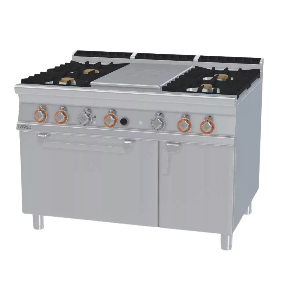 A kombinált felület lehetővé teszi a sokoldalú használatot: egy egyező, nagy felületű francia lap gondoskodik a tepsisek, nagy serpenyők és serlők egyidejű elhelyezéséről, míg a négy különálló égő gyors és precíz lángszabályozást kínál a serpenyős, fazékos műveletekhez. Ez a felépítés ideális olyan konyhák számára, ahol egyszerre többféle konyhatechnológiai eljárást kell hatékonyan végezni.