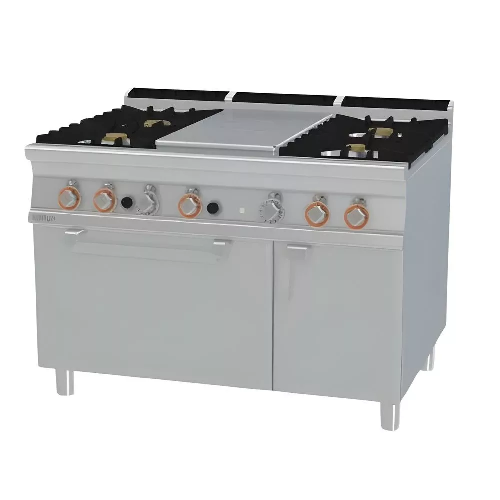 Olaszországban gyártott, rozsdamentes acél kivitelű, gázüzemű, ipari tűzhely, főzőlap, 2 mm vastag munkalappal, elektromos statikus sütővel, tárolóval, IPX5 védelemmel. A főzőfelület 1 zónás francia lap, valamint 4 égőfej. Sütőrács mérete: GN2/1.