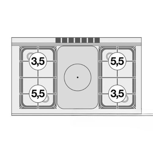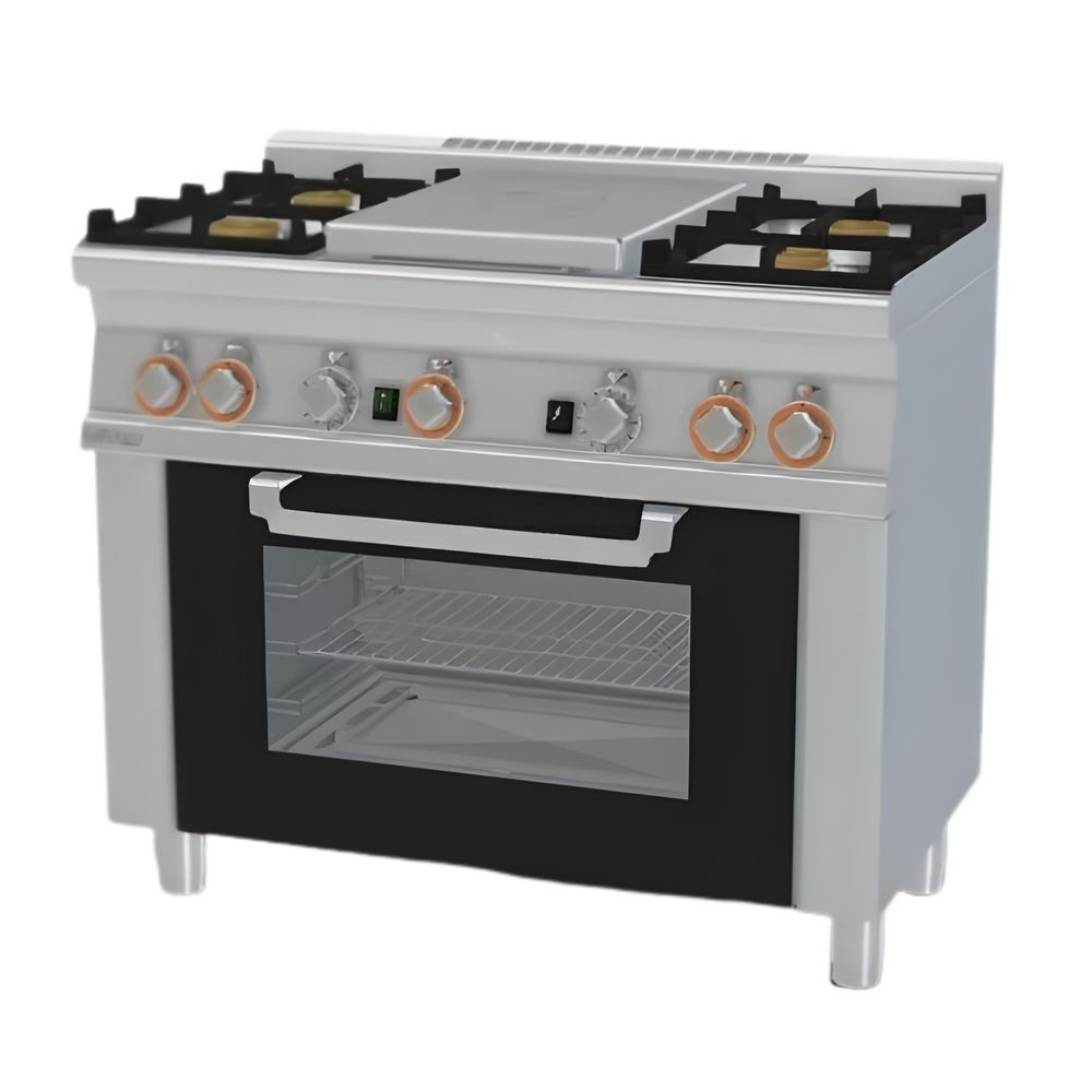 Olaszországban gyártott, rozsdamentes acél kivitelű, gázüzemű, ipari tűzhely, főzőlap, 1 mm vastag munkalappal, gázüzemű statikus sütővel, IPX5 védelemmel. A főzőfelület 1 zónás francia lap és 4 égőfej. Sütőrács mérete: GN1/1.