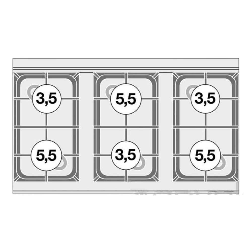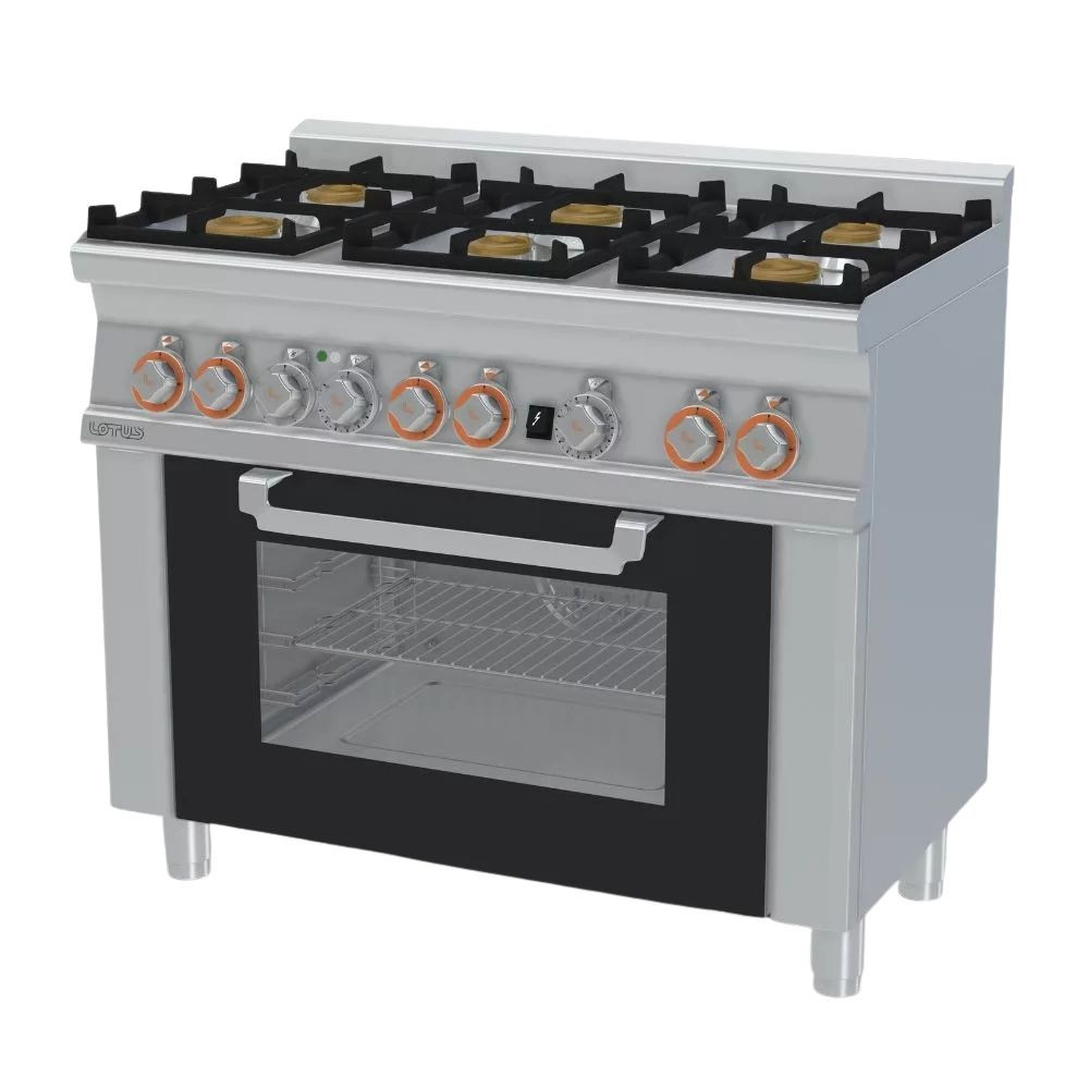 Olaszországban gyártott, rozsdamentes acél kivitelű gázüzemű ipari tűzhely, 6 égőfejjel, 1 mm vastag munkalappal, elektromos multifunkciós sütővel, IPX5 védelemmel. Sütőrács mérete: GN1/1.