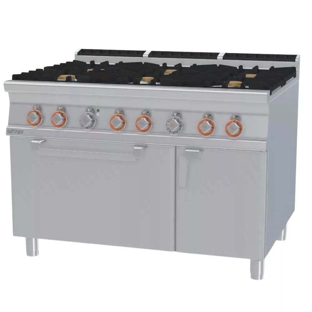 Olaszországban gyártott, rozsdamentes acél kivitelű gázüzemű ipari tűzhely, 6 égőfejjel, 2 mm vastag munkalappal, elektromos légkeveréses sütővel, tárolóval, IPX5 védelemmel. Sütőrács mérete: GN1/1.