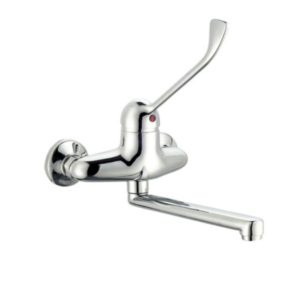 Ez a falra szerelhető keverőcsap kimondottan olyan környezetekhez készült, ahol a tartósság, a könnyű kezelhetőség és a higiénia elsődleges szempont. A krómozott öntvénytest biztosítja a hosszú élettartamot és a kopásállóságot, miközben az alsó kifolyó praktikus csatlakozási lehetőséget ad gépek, mosogatók vagy szerelvények alatti vízfelhasználáshoz. A kialakítás mind ipari, mind egészségügyi vagy közösségi helyiségekben megbízható megoldást nyújt.
