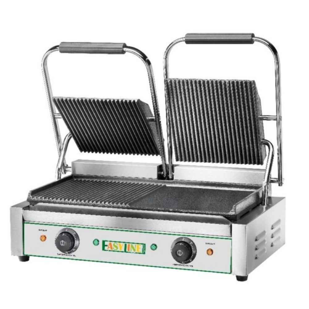 Ipari kontakt grill készülék, mely kiválóan alkalmas húsok, halak, zöldségek, szendvicsek grillezésére. A sütőfelület 475x230 mm, 2 zónával rendelkezik, a felület anyaga öntöttvas, típusa bordázott és sima (a kép csak illusztráció).