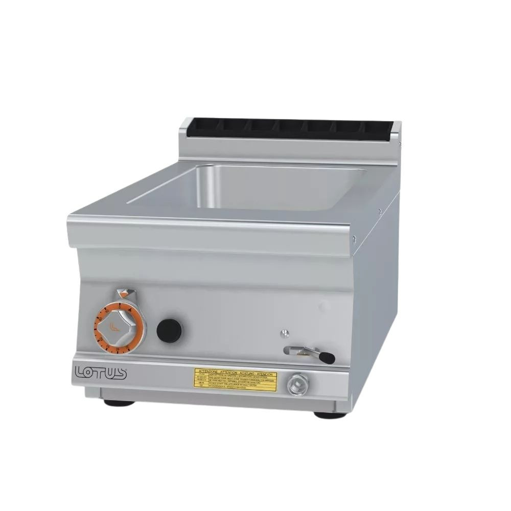 Ez a gázüzemű, asztali bain-marie melegentartó kifejezetten professzionális vendéglátóipari környezetekhez készült, ahol az egyenletes, kíméletes melegen tartás és az állandó hőmérséklet kulcsfontosságú. GN 1/1 méretű, egy medencés kialakítása lehetővé teszi a standard gáztrélerek és tálcák gyors beillesztését, így ideális választás éttermek, szállodák, közétkeztetési konyhák és catering szolgáltatók számára. A gázüzem előnye, hogy rövid felfűtési időt és egyszerű szabályozhatóságot kínál, különösen olyan helyeken, ahol a hálózati áram korlátozott vagy a gázhálózat előnyösebb megoldás.