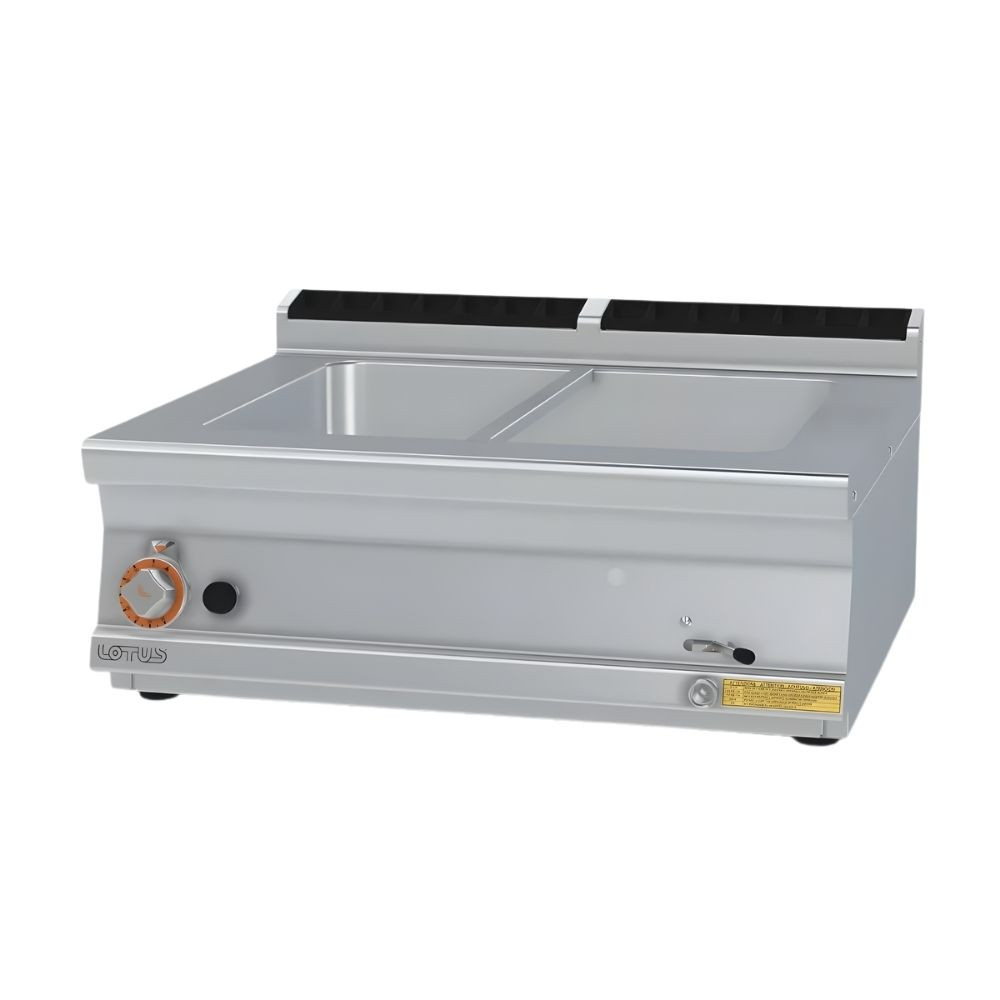 A bain-marie 2 mm vastag munkalappal, Scotch-Brite szatén felületkezeléssel, krómozott részletekkel és hátsó fröccsenésgátló peremmel készül. A lekerekített sarkok nemcsak esztétikusak, hanem megkönnyítik a tisztítást is. Az IPX5 vízállóságú kezelőgombok biztonságos használatot garantálnak nedves konyhai környezetben.