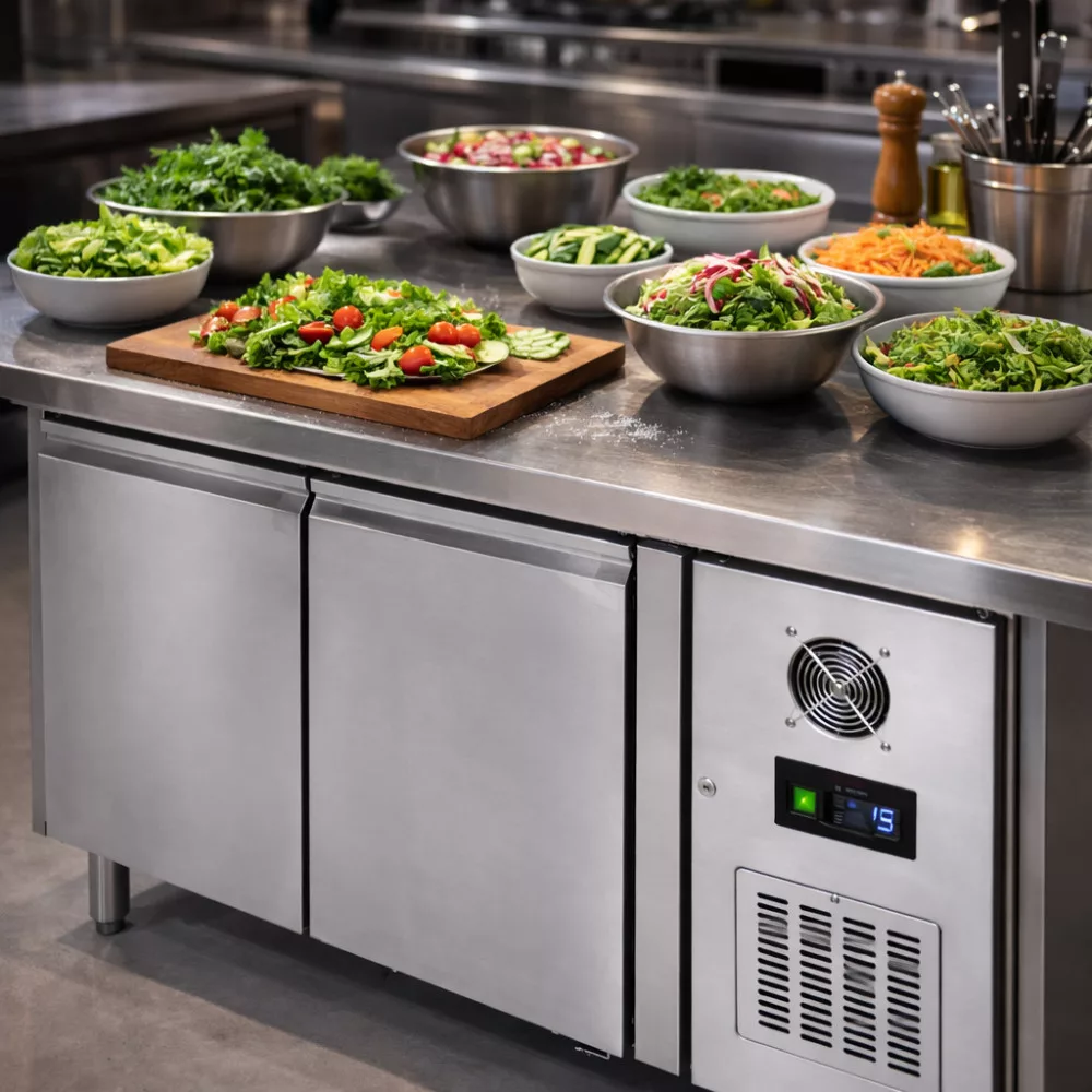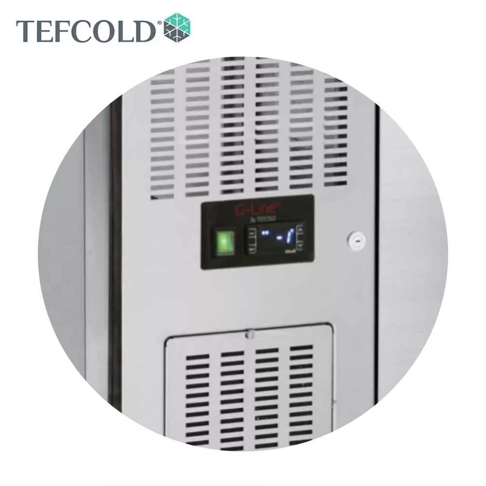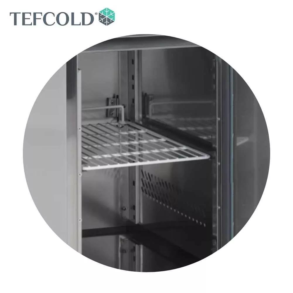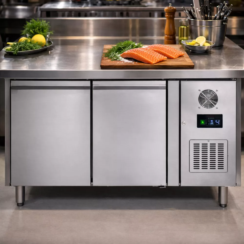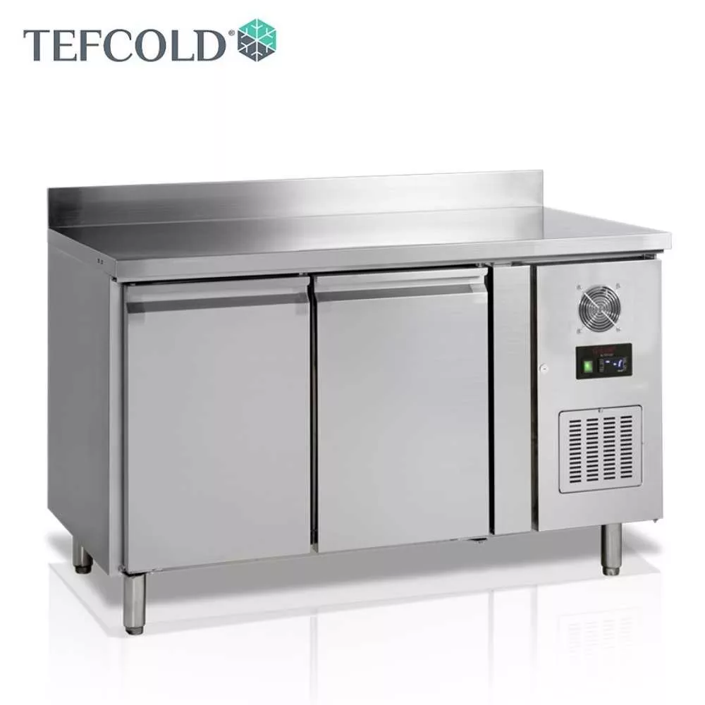 Tefcold mélyhűtött munkaasztal. Rozsdamentes acél kivitel, jobb oldalon elhelyezett hűtőegység, ventilációs hűtés, -20/-10°C hűtési tartomány.