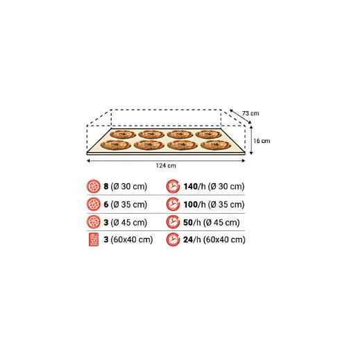 Ez a professzionális, multifunkciós sütő rugalmasan alakítható az igényeidhez: különböző belmagasságokkal (16, 22 vagy 30 cm) és többféle sütőkamra-típussal is rendelhető – például Multibake, Fastbake, Romanbake, Stonebake, Pastrybake vagy Steambake. Tökéletes megoldás klasszikus, nápolyi vagy római tepsis pizzákhoz, pékségeknek, cukrászdáknak és minden gasztronómiai vállalkozásnak. Sokoldalú felhasználásra válaszd a Multibake kamrát, ha pedig egy adott termékre specializálódnál, akkor ott a Romanbake, Stonebake, Pastrybake vagy Steambake.