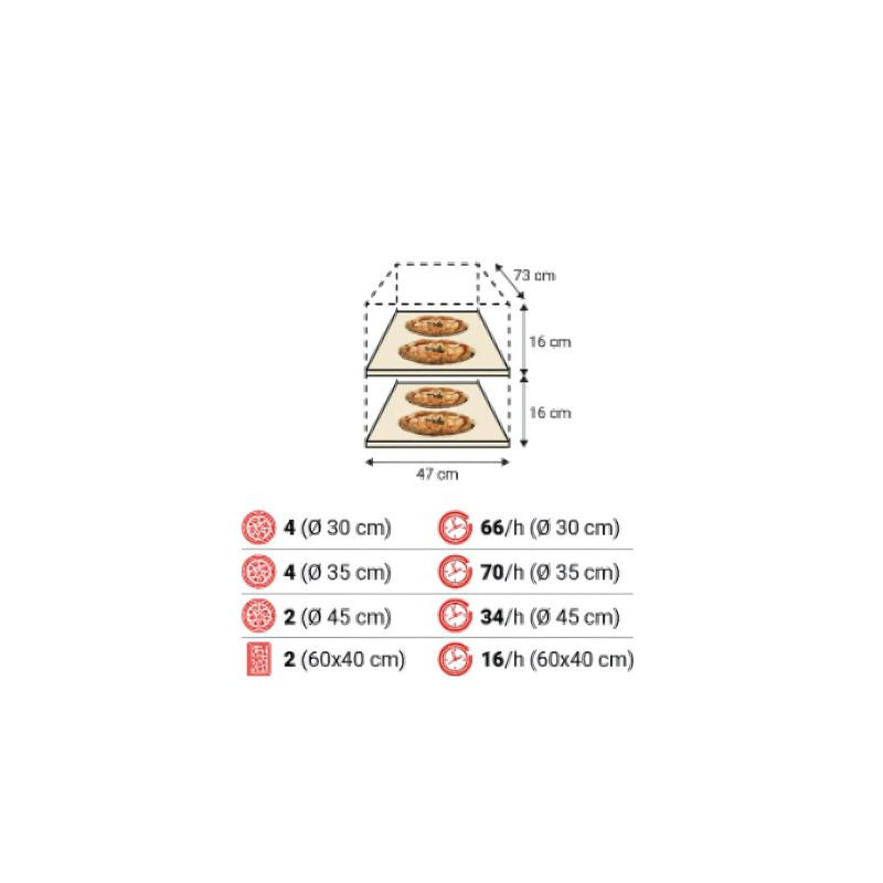 - Fastbake - Patented “biscotto” felületű sütőtér: ideális a modern nápolyi stílusú pizzához; akár 500 °C-ra felfűthető, és 2 perc 30 másodperc alatt készre süt. A termelékenység 25%-kal magasabb.