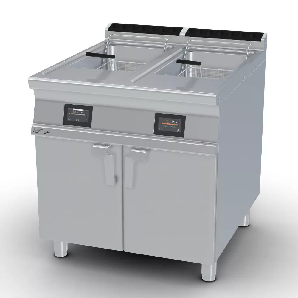 Olaszországban gyártott, háromfázisú, elektromos ipari olajsütő, fritőz berendezés, rozsdamentes acélból, tárolóval, 2x18 literes medencével, IPX5 védelemmel.