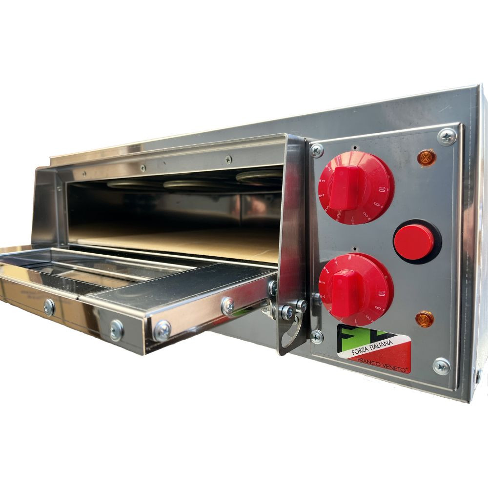 A pizzakemence belső világítással, megfigyelőablakkal, lenyitható ajtóval és 14 mm vastag BRAZIL samottlap betéttel rendelkezik. Felhasználóbarát kezelőpanel, szabályozható alsó-felső fűtéssel, hüvelyes fűtőelemek segítségével, 60-350 °C-ig felmelegíthető.