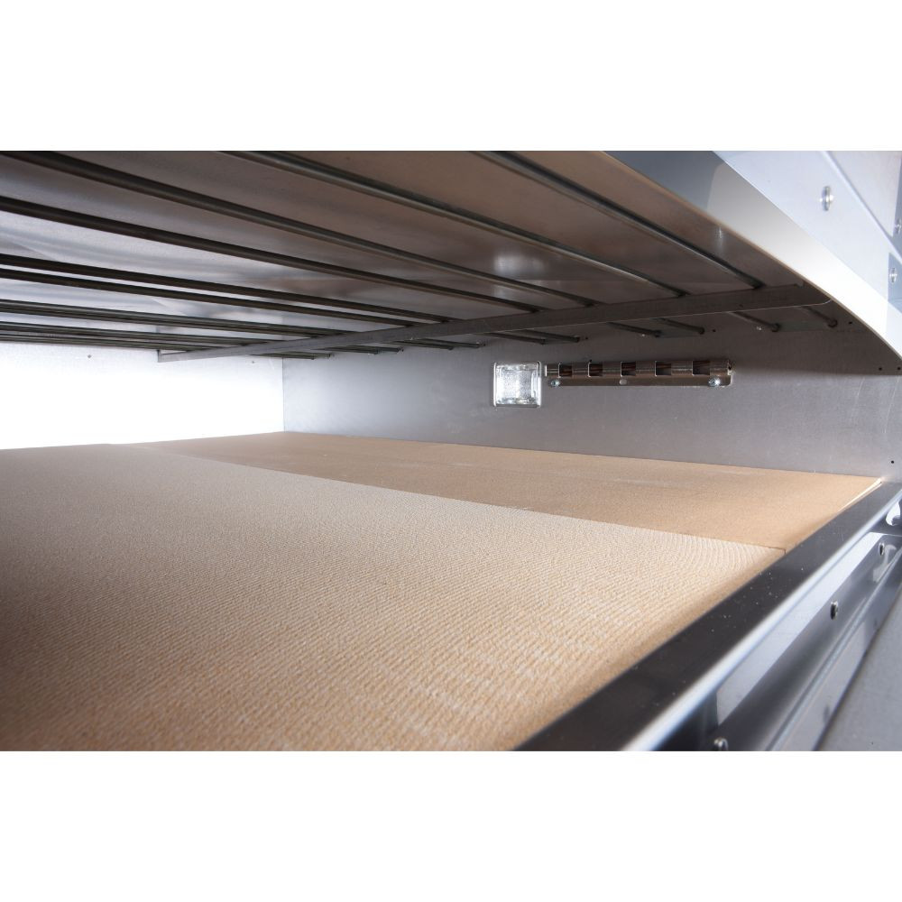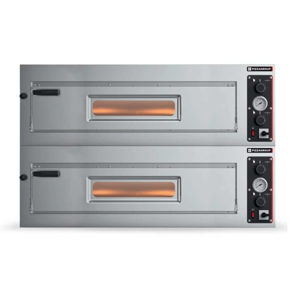 Ipari pizzasütő, pizzakemence rozsdamentes acélból. A pizzakemence belső világítással, valamint megfigyelőablakkal rendelkezik. Minden kamra külön főkapcsolóval és hőfokszabályzóval vezérelhető. Kamraméret alsó samott borítással: 105x105x15 cm. Felár ellenében teljes samott borítással is kérhető, mely esetében a kamraméret: 102x103,5x13,5 cm. A készülék súlya teljes borítás esetén 321 kg.