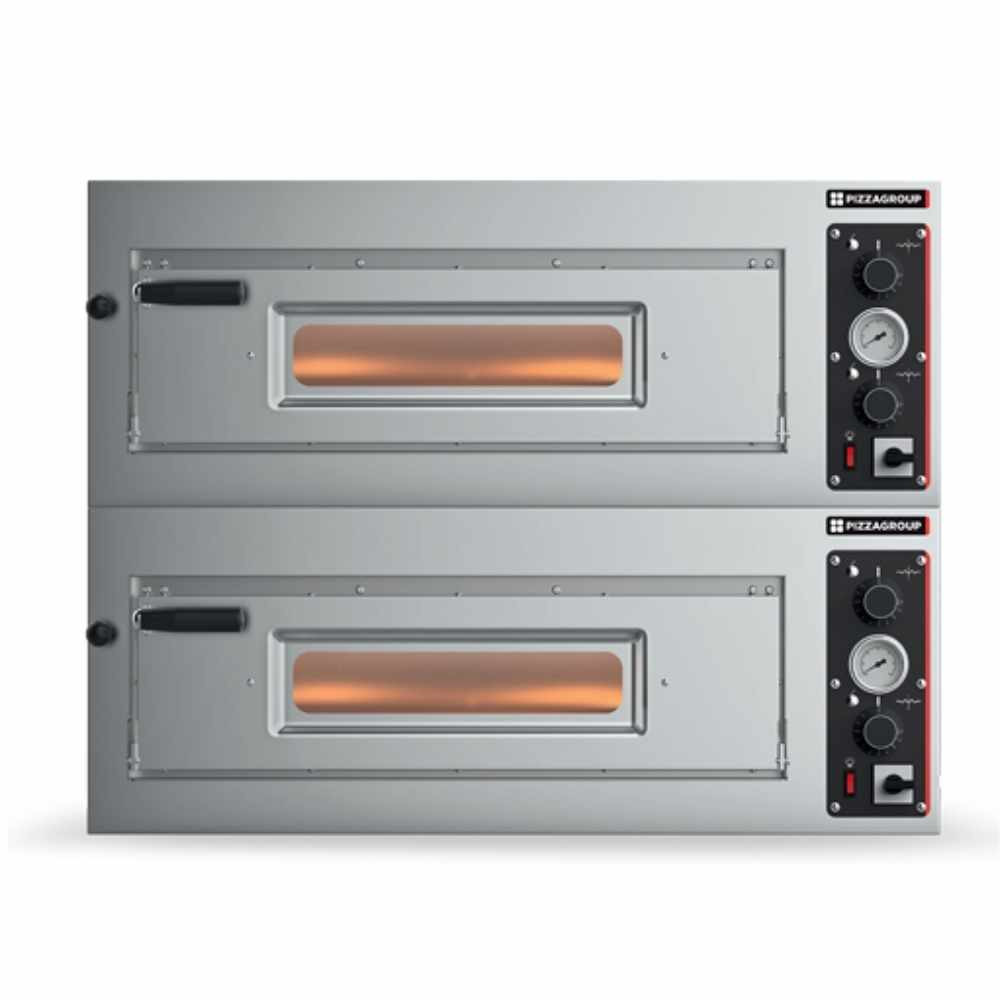 Ipari pizzasütő, pizzakemence rozsdamentes acélból. A pizzakemence belső világítással, valamint megfigyelőablakkal rendelkezik. Minden kamra külön főkapcsolóval és hőfokszabályzóval vezérelhető. Kamraméret alsó samott borítással: 70x70x15 cm. Felár ellenében teljes samott borítással is kérhető, mely esetében a kamraméret: 67x68,5x13,5 cm. A készülék súlya teljes borítás esetén 193 kg.