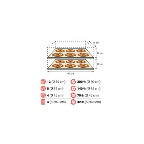- Fastbake - Patented “biscotto” felületű sütőtér: ideális a modern nápolyi stílusú pizzához; akár 500 °C-ra felfűthető, és 2 perc 30 másodperc alatt készre süt. A termelékenység 25%-kal magasabb.
