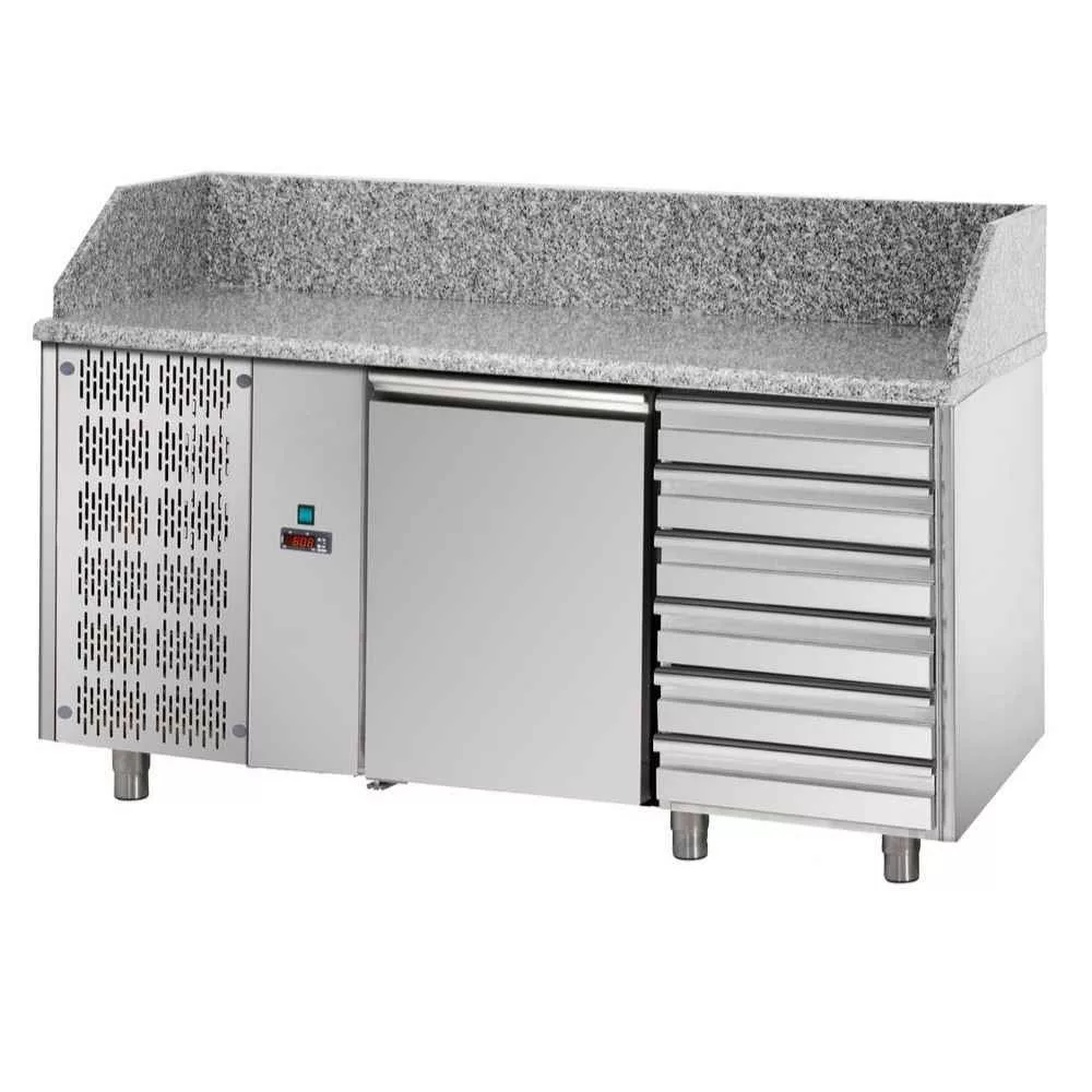 Olaszországban gyártott hűtött pizzapult, 1 ajtós kivitelben. Az ajtós tároló belső mérete 600x400 mm, a hűtési tartomány pedig 0/+10 °C. A pizzapult rozsdamentes acélból készült, gránit fedlappal, 3 oldali felhajtással rendelkezik. A hűtőegység a bal oldalon található, a jobb oldalon 6 db semleges fiók.