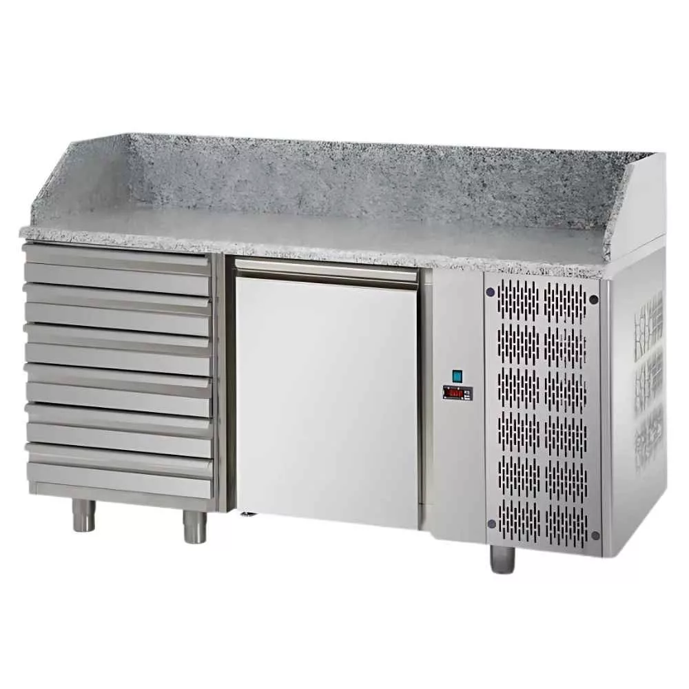 Olaszországban gyártott hűtött pizzapult, 1 ajtós kivitelben. Az ajtós tároló belső mérete 600x400 mm, a hűtési tartomány pedig 0/+10 °C. A pizzapult rozsdamentes acélból készült, gránit fedlappal, 3 oldali felhajtással rendelkezik. A hűtőegység a jobb oldalon található, a bal oldalon 6 db semleges fiók.