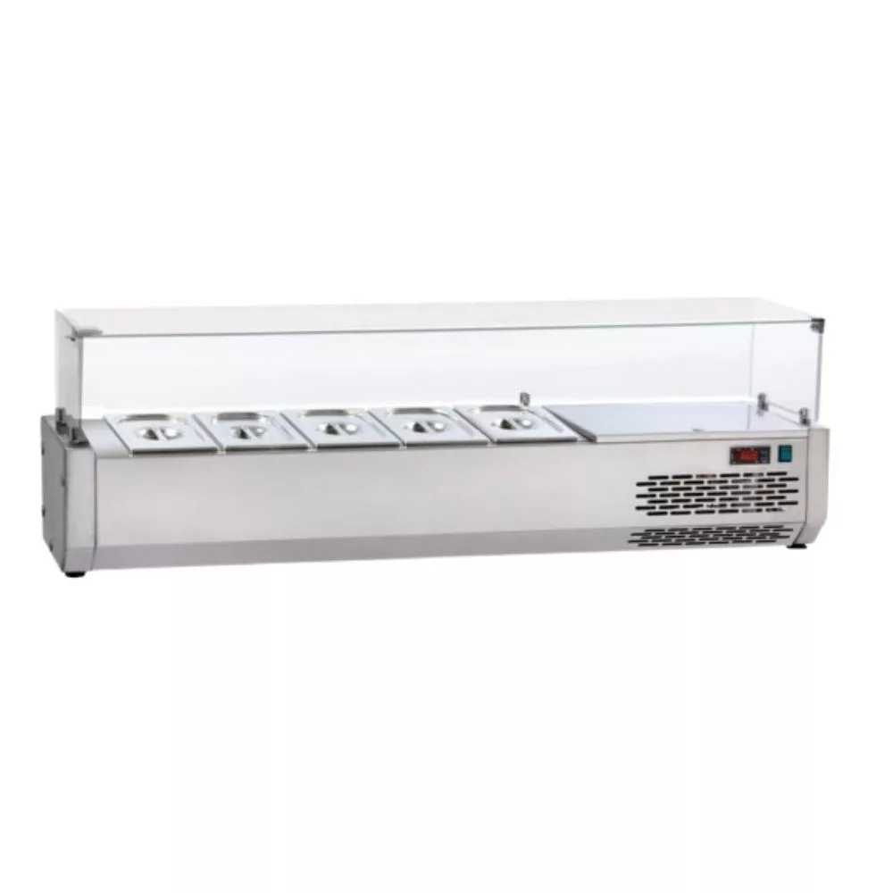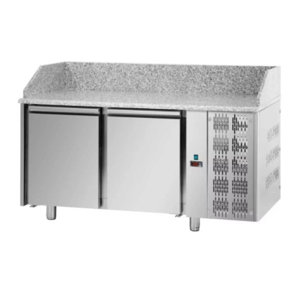 Az ajtós tároló belső mérete 600x400 mm, a hűtési tartomány pedig 0/+10 °C. A pizzapult rozsdamentes acélból készült, gránit fedlappal, 3 oldali felhajtással rendelkezik. A hűtőegység a jobb oldalon található.