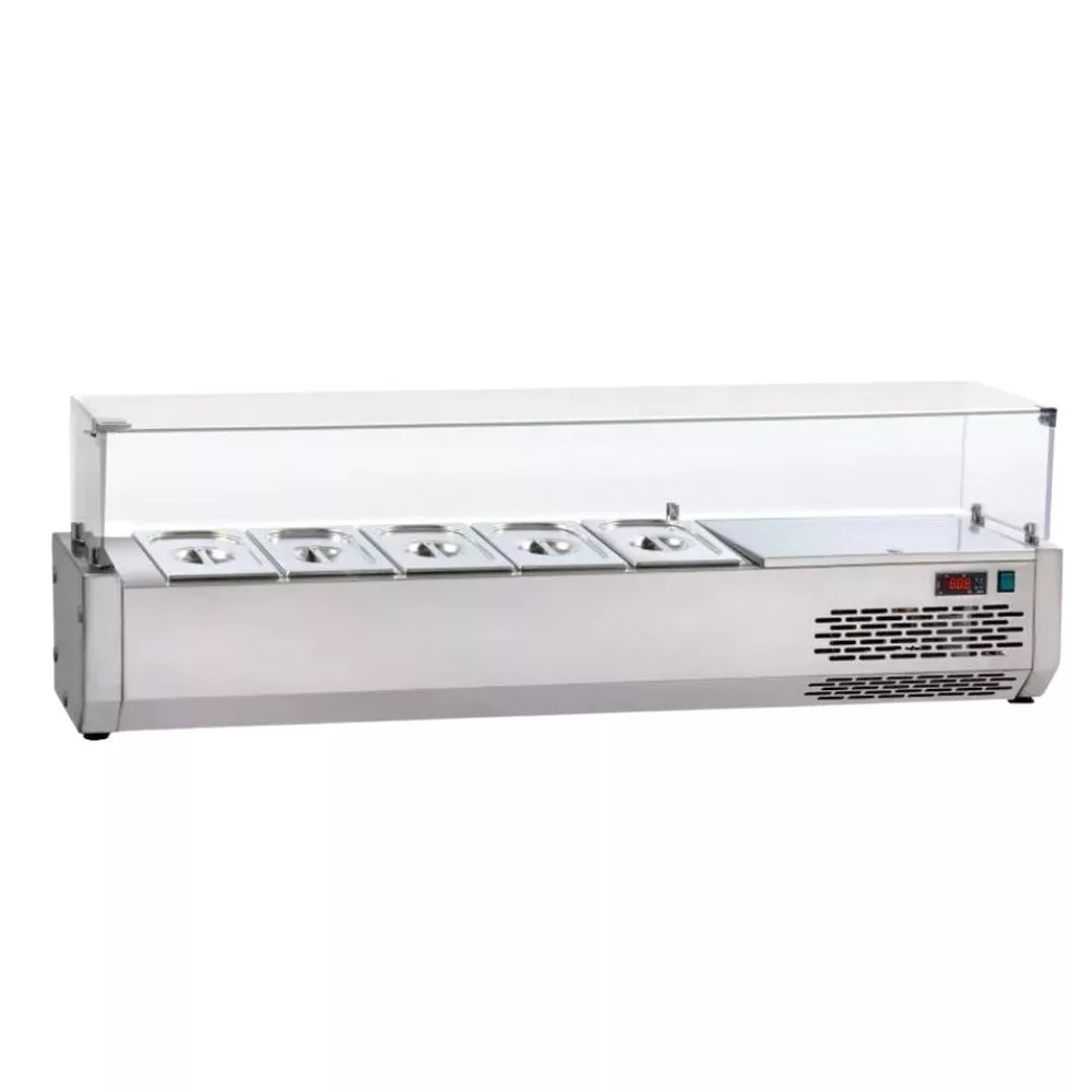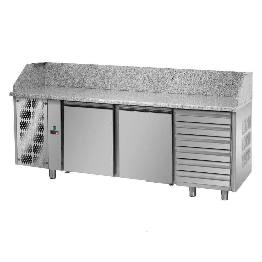 Az ajtós tároló belső mérete 600x400 mm, a hűtési tartomány pedig 0/+10 °C. A pizzapult rozsdamentes acélból készült, gránit fedlappal, 3 oldali felhajtással rendelkezik. A hűtőegység a jobb oldalon található, a bal oldalon 6 db semleges fiók.