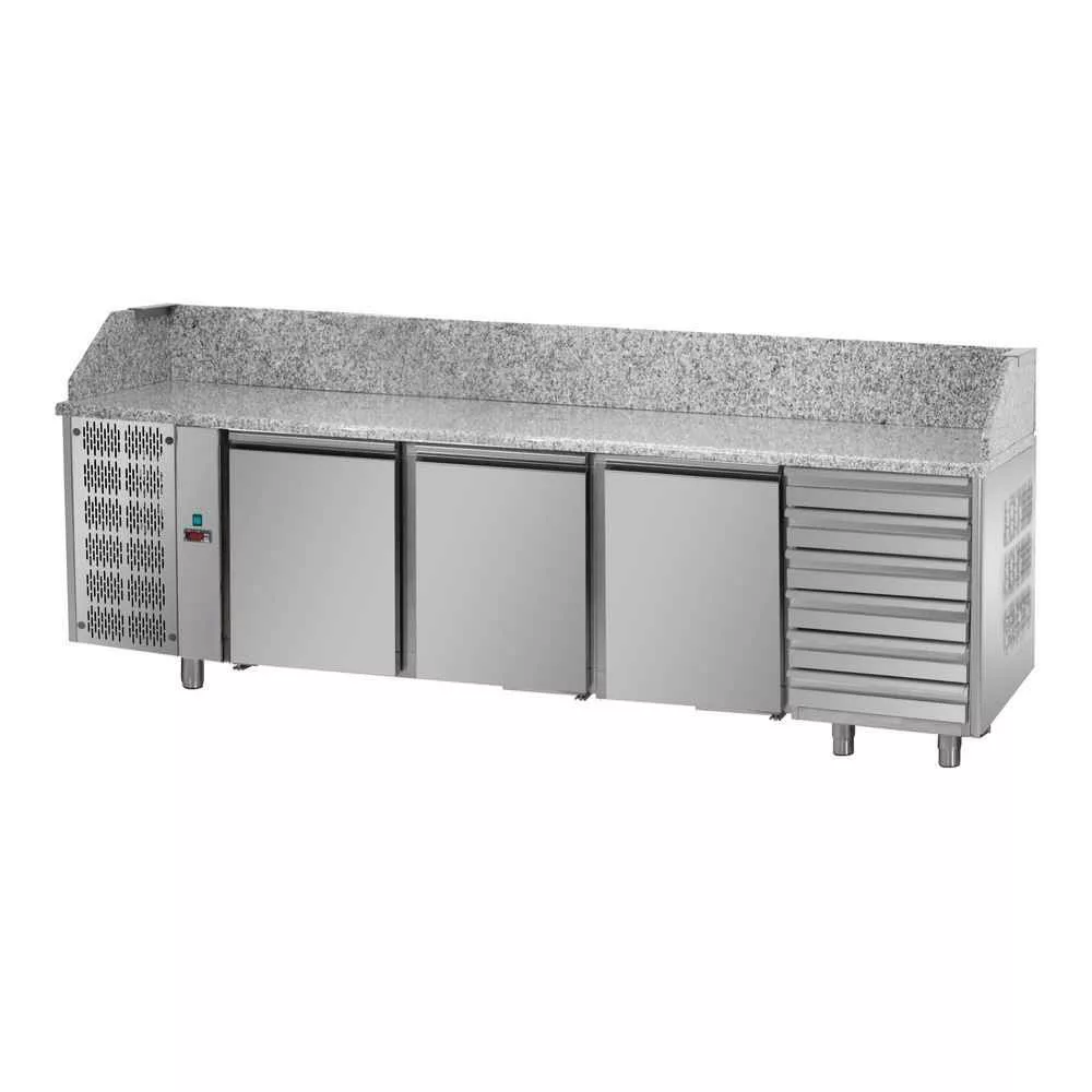 Olaszországban gyártott hűtött pizzapult, 3 ajtós kivitelben. Az ajtós tároló belső mérete 600x400 mm, a hűtési tartomány pedig 0/+10 °C. A pizzapult rozsdamentes acélból készült, gránit fedlappal, 3 oldali felhajtással rendelkezik. A hűtőegység a bal oldalon található, a jobb oldalon 6 db semleges fiók.