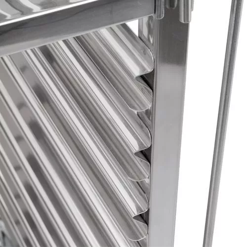 Rozsdamentes acélból készült regál, tálcaszedő kocsi, 18 db GN 1/1 tálca férőhellyel, 90 mm-es sinbeosztással.