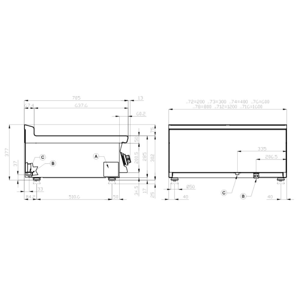 Olaszországban gyártott, nagykonyhai használatra tervezett 1 zónás, sima felületű, asztali, elektromos  rostlap, lapsütő, szeletsütő rozsdamentes acélból, 2 mm vastag munkalappal, IPX5 védelemmel.
