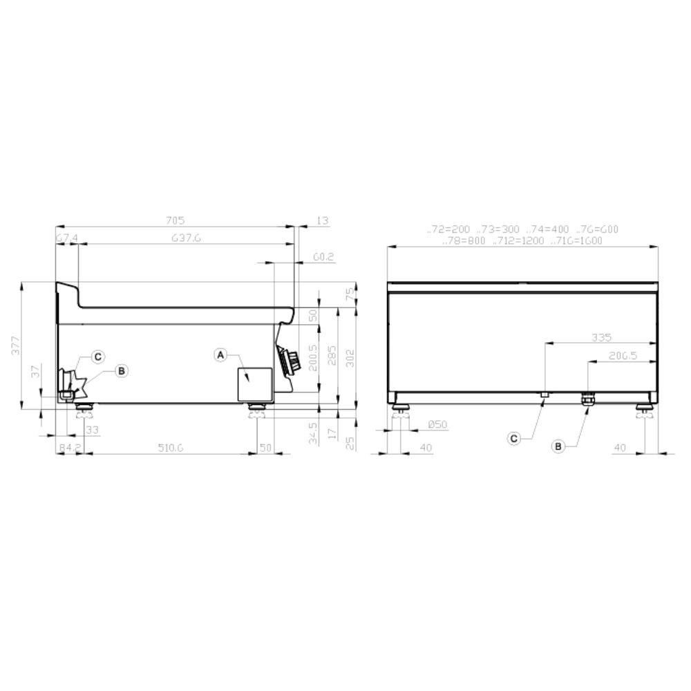 Olaszországban gyártott, nagykonyhai használatra tervezett 1 zónás, sima felületű, asztali, elektromos rostlap, lapsütő, szeletsütő rozsdamentes acélból, 2 mm vastag munkalappal, IPX5 védelemmel.