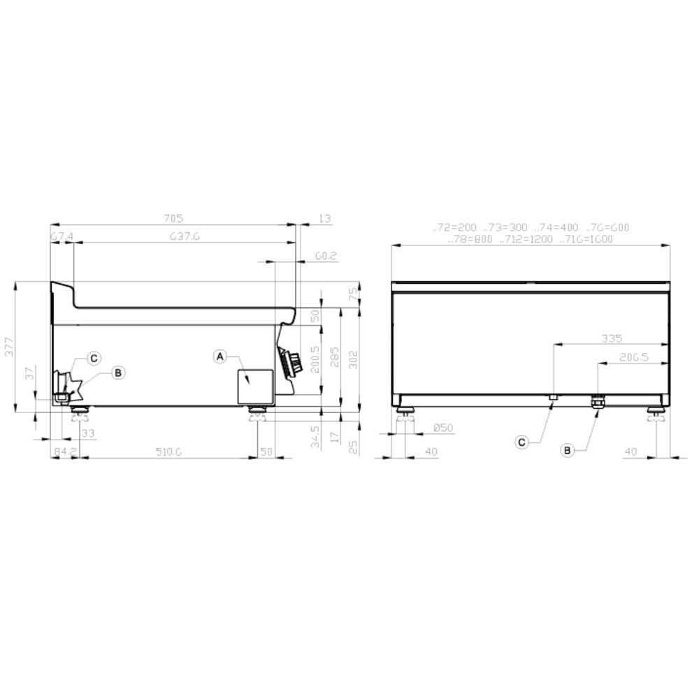 Olaszországban gyártott, nagykonyhai használatra tervezett 2 zónás, bordázott felületű, asztali, elektromos rostlap, lapsütő, szeletsütő rozsdamentes acélból, 2 mm vastag munkalappal, IPX5 védelemmel.