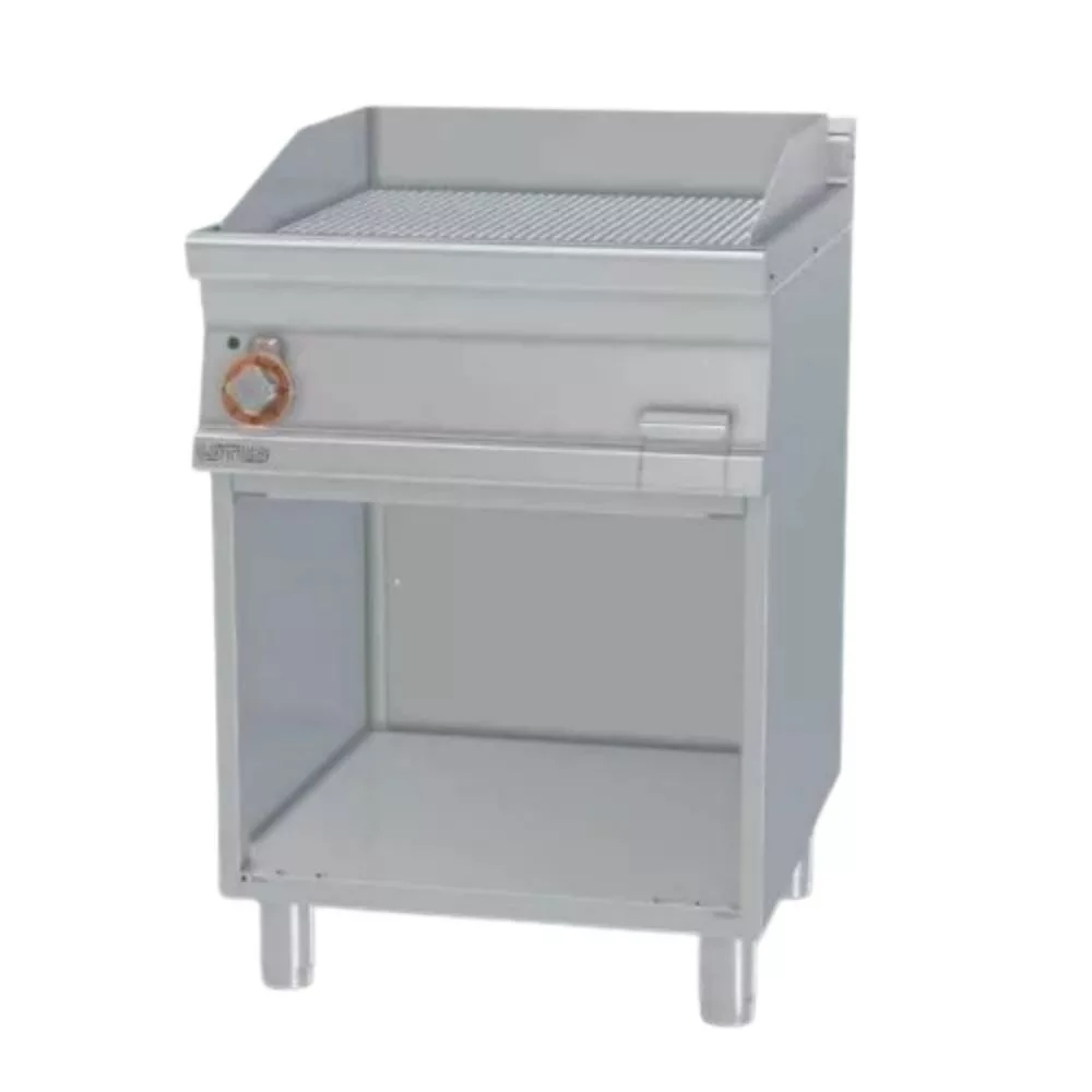 Olaszországban gyártott, nagykonyhai használatra tervezett 1 zónás, bordázott felületű, főzősorba illeszhető, elektromos rostlap, lapsütő, szeletsütő rozsdamentes acélból, 2 mm vastag munkalappal, IPX5 védelemmel, nyitott alsó tárolóval.