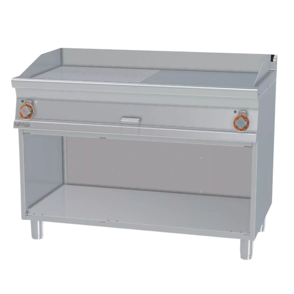 Olaszországban gyártott, nagykonyhai használatra tervezett 2 zónás, 1/2 bordázott + 1/2 sima felületű, főzősorba illeszhető, elektromos rostlap, lapsütő, szeletsütő rozsdamentes acélból, 2 mm vastag munkalappal, IPX5 védelemmel, nyitott alsó tárolóval.