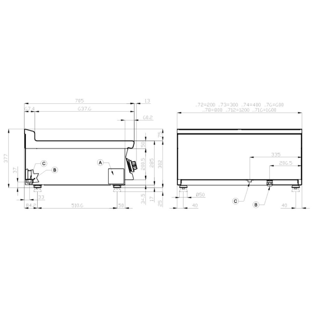 Olaszországban gyártott, nagykonyhai használatra tervezett 1 zónás, sima felületű, asztali, gázüzemű rostlap, lapsütő, szeletsütő rozsdamentes acélból, 2 mm vastag munkalappal, IPX5 védelemmel.