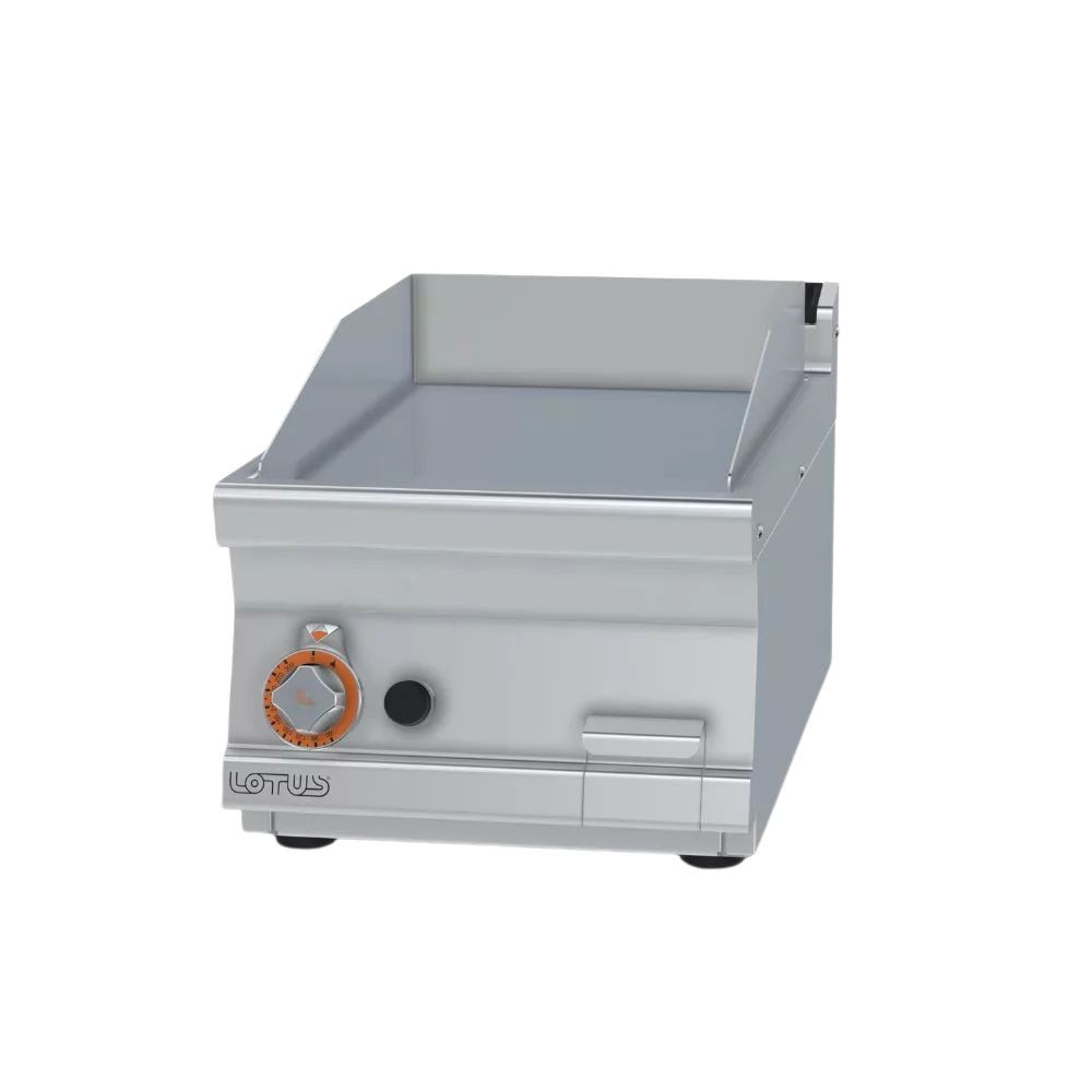 Olaszországban gyártott, nagykonyhai használatra tervezett 1 zónás, sima felületű, asztali, gázüzemű rostlap, lapsütő, szeletsütő rozsdamentes acélból, 2 mm vastag munkalappal, IPX5 védelemmel.