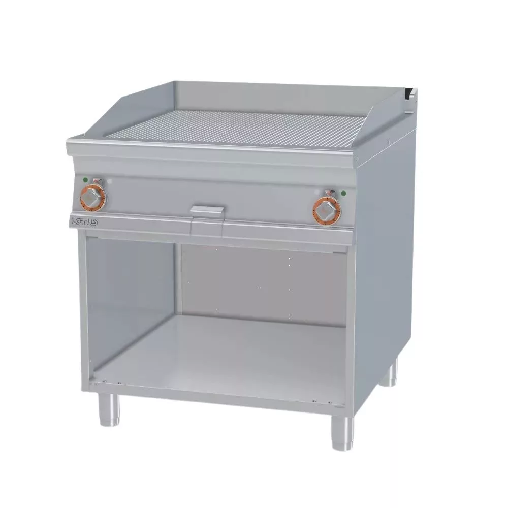 Olaszországban gyártott, nagykonyhai használatra tervezett 2 zónás, bordázott felületű, főzősorba illeszhető, elektromos rostlap, lapsütő, szeletsütő rozsdamentes acélból, 2 mm vastag munkalappal, IPX5 védelemmel, nyitott alsó tárolóval.