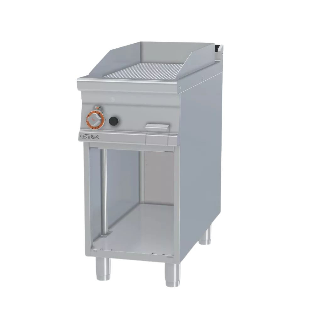 Olaszországban gyártott, nagykonyhai használatra tervezett 1 zónás, bordázott felületű, főzősorba illeszhető, gázüzemű rostlap, lapsütő, szeletsütő rozsdamentes acélból, 2 mm vastag munkalappal, IPX5 védelemmel, nyitott alsó tárolóval.