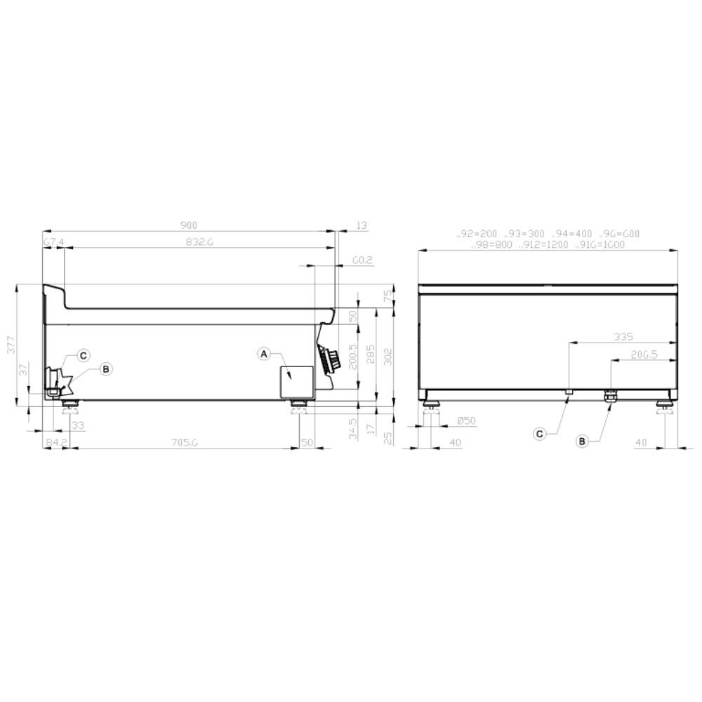 Olaszországban gyártott, nagykonyhai használatra tervezett 1 zónás, bordázott felületű, asztali, gázüzemű rostlap, lapsütő, szeletsütő rozsdamentes acélból, 2 mm vastag munkalappal, IPX5 védelemmel.