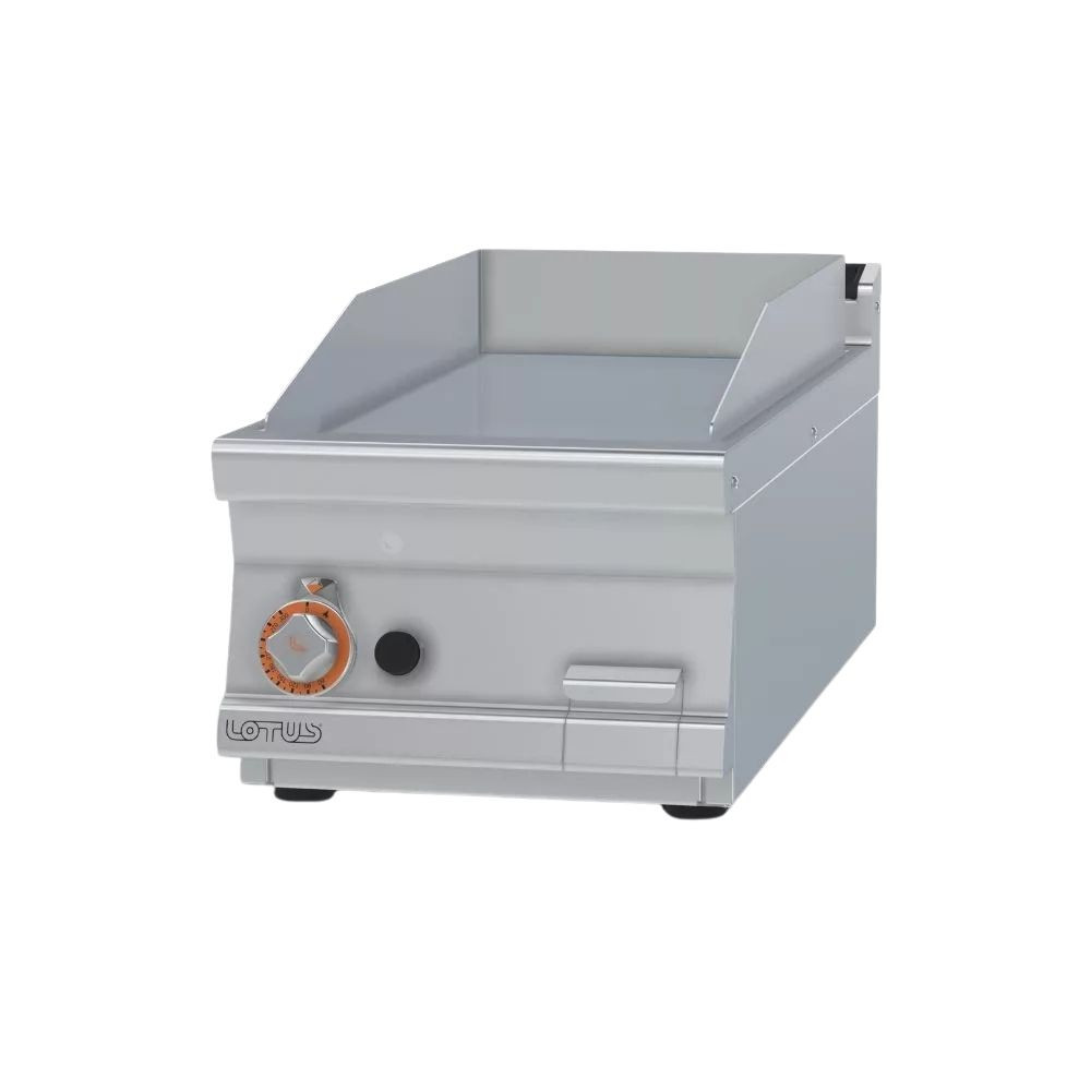 Olaszországban gyártott, nagykonyhai használatra tervezett 1 zónás, sima felületű, asztali, gázüzemű rostlap, lapsütő, szeletsütő rozsdamentes acélból, 2 mm vastag munkalappal, IPX5 védelemmel.