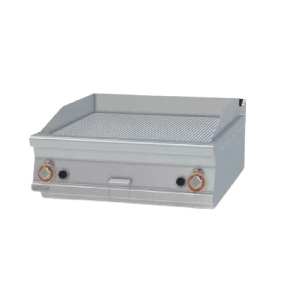 Olaszországban gyártott, nagykonyhai használatra tervezett 2 zónás, bordázott felületű, asztali, gázüzemű rostlap, lapsütő, szeletsütő rozsdamentes acélból, 2 mm vastag munkalappal, IPX5 védelemmel.