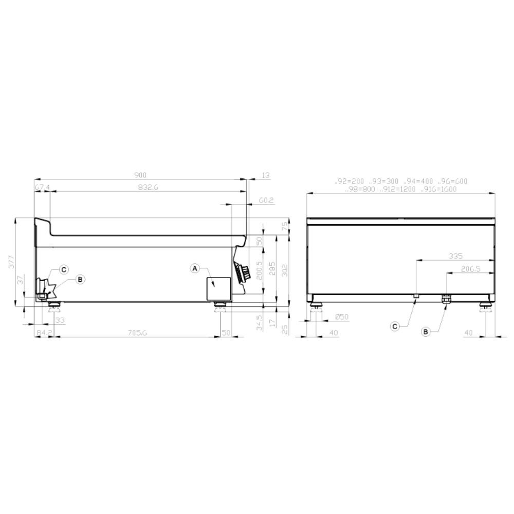Olaszországban gyártott, nagykonyhai használatra tervezett 2 zónás, bordázott felületű, asztali, gázüzemű rostlap, lapsütő, szeletsütő rozsdamentes acélból, 2 mm vastag munkalappal, IPX5 védelemmel.