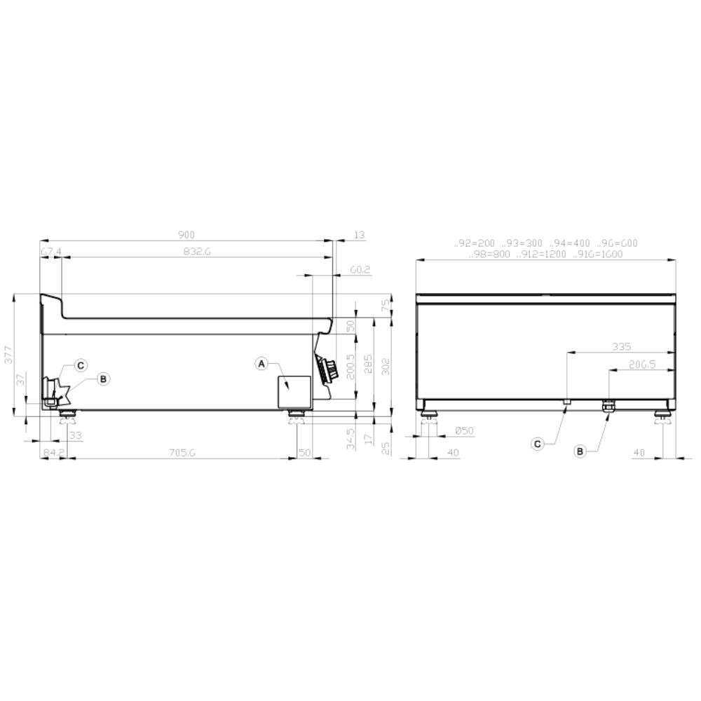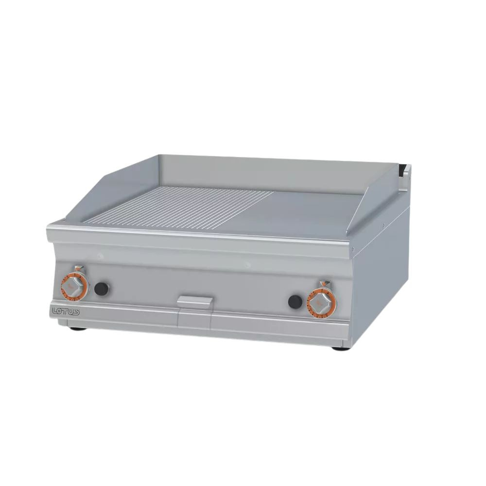 Olaszországban gyártott, nagykonyhai használatra tervezett 2 zónás, 1/2 bordázott + 1/2 sima felületű, asztali, gázüzemű rostlap, lapsütő, szeletsütő rozsdamentes acélból, 2 mm vastag munkalappal, IPX5 védelemmel.