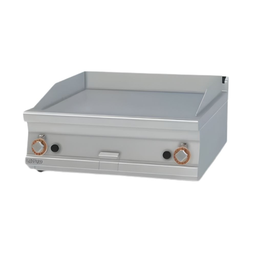 Olaszországban gyártott, nagykonyhai használatra tervezett 2 zónás, sima felületű, asztali, gázüzemű rostlap, lapsütő, szeletsütő rozsdamentes acélból, 2 mm vastag munkalappal, IPX5 védelemmel.